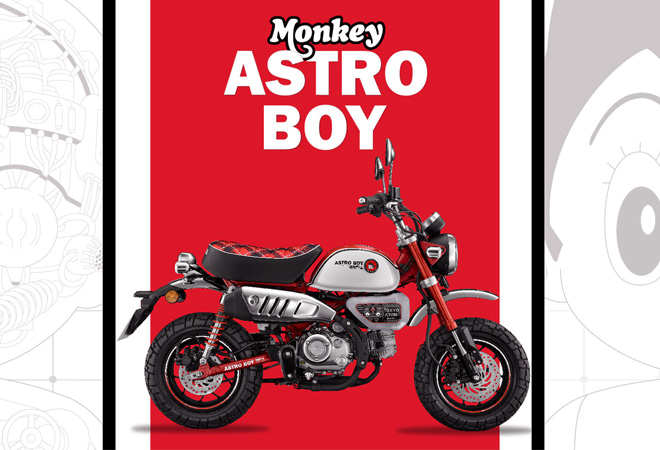 Honda Monkey Astro Boy Limited Edition, didesain oleh tim H2C Design dari Honda, mengusung legenda Astro Boy dengan tangki oli premium, Pearl White, dan pola merah-hitam. Dibedakan dengan logo Astro Boy, hak cipta asli dari Jepang, menjalankan Serial Number khusus di badan motor yang menunjukkan edisi terbatas untuk kendaraan tertentu.